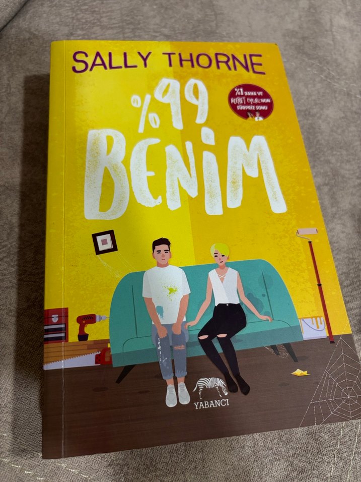 Sally Thorne'un '%99 Benim' adlı romanı, sarı kapak ve kanepede oturan çizimli karakterlerle. Sürpriz ses özelliği ve Yabancı yayınevi etiketiyle.