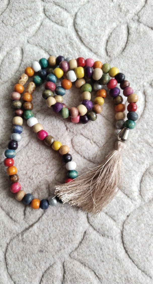 99 lu ,çok renkli ahşap boncuklardan oluşan tesbih, kolye olarak da kullanılabilecek açık kahve tonunda püskül ve batik desen detaylarına sahip, günlük kullanıma uygun.