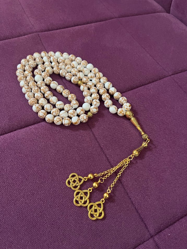 Yenidir, kullanılmadı, başka modelde karar kıldığım için geldiği gibi satışa koydum. Çok şık bir imamesi, camımsı yapıda sarı beyaz boncukları ile elegant ama minimal bir yapısı var. Boncuklar Havlit taşındandır. Boncuk çapı 10mm. Sıfırdır. Ölçmedim ama imame ile beraber 50cm civarı uzunluğu var.