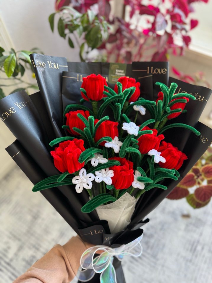 Bohem tarzında, kırmızı ve beyaz çiçeklerden oluşan el yapımı buket. Siyah kağıda sarılı, 'I Love You' yazılı ve şeffaf kurdele ile bağlanmış. İ G; Kristall.Flowers