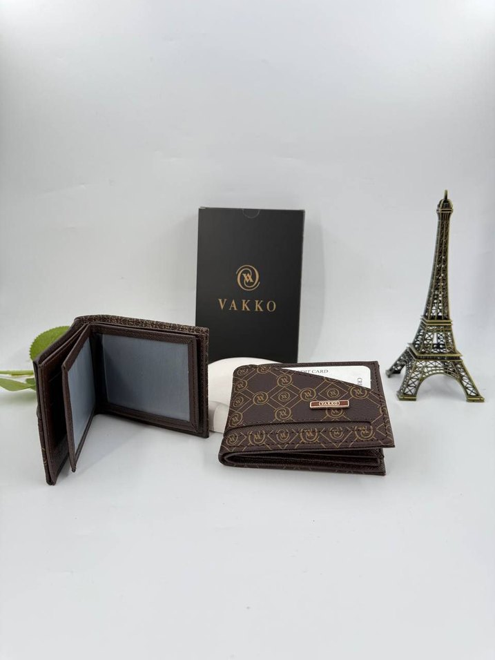 Vakko marka, koyu kahverengi desenli deri kadın cüzdan, cırt cırtlı kapanış ve çoklu kart bölmeleriyle modern klasik tarz sunar.
