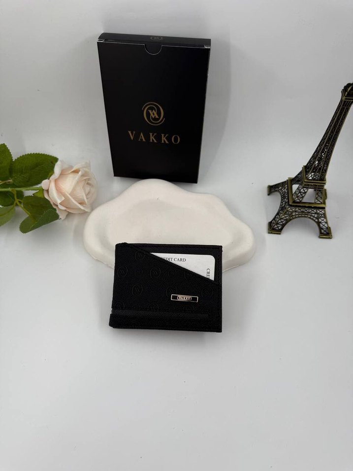 Vakko marka siyah deri kadın cüzdanı, modern klasik tarzda, baskılı desene sahip. Günlük kullanım için cırt cırtlı kapanışlı.