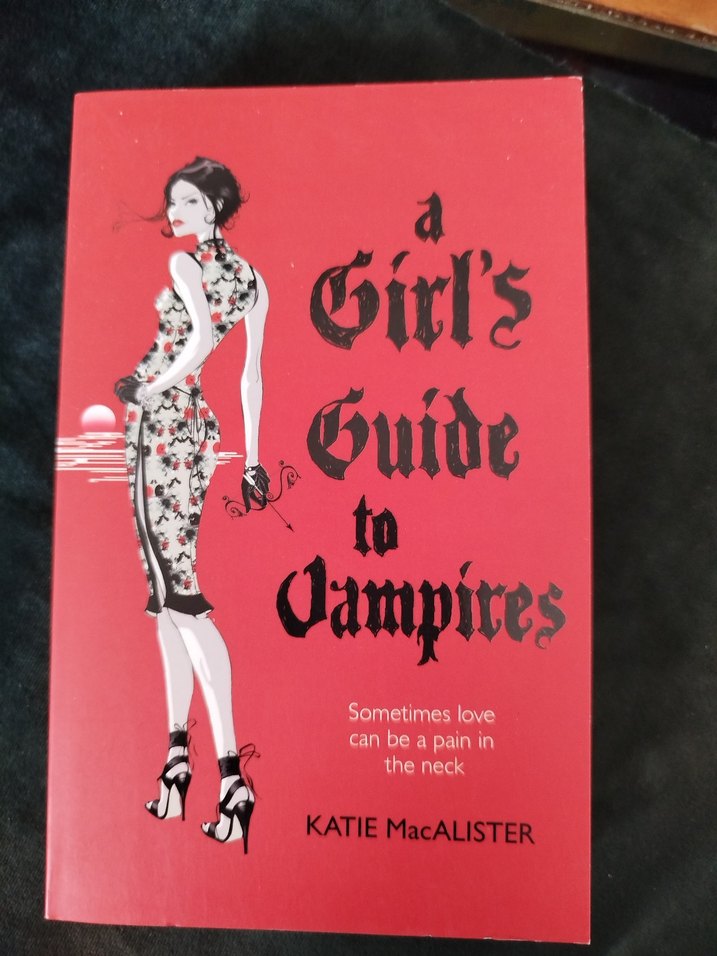 Katie MacAlister'ın 'A Girl's Guide to Vampires' adlı romanı, vampir temasında aşkın zorluklarını anlatıyor. Kapağında kırmızı zemin üzerinde şık bir kadın var. ♀️