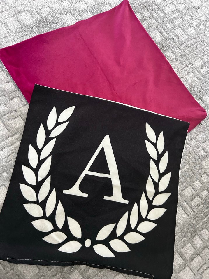 A harfli kırlent kılıfı sorunu yok Baskılı 'A' harfi ve defne dalı motifi gri zemin üzerinde, arka yüzü ise düz bordo renkte yastık kılıfı.