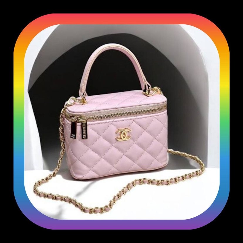 Pastel pembe deri kapitone desenli, fermuarlı üst kısmı ve altın zincir askısı olan klasik ve modern Paris tarzı kadın çantası.