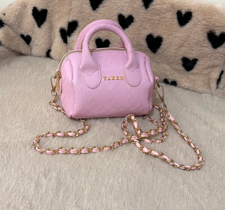 Pastel pembe deri kadın çanta, yılan derisi desenli ve zincir detaylıdır, günlük şık sokak modasına uygundur. Üzerinde 'VAKKO' yazısı bulunur.