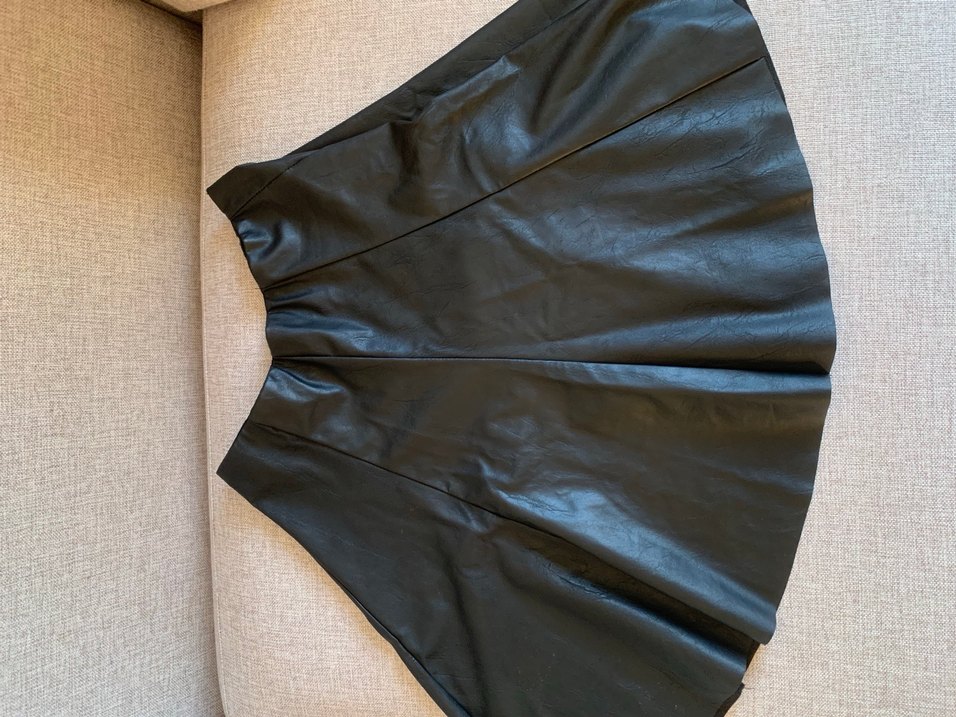 Parlak siyah deri, içi kalın ve a kesim, gotik tarzda, günlük kullanıma uygun, bele oturup aşağı doğru açılan etek.