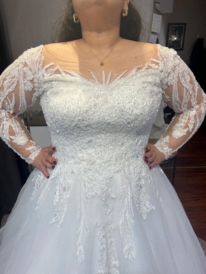 Boncuklu dantel simli tül uzun kollu arka baglana ve dügme detaylı 56 beden gelınlık bel öevresı 110 gögüs çevresı 125 pazu 44