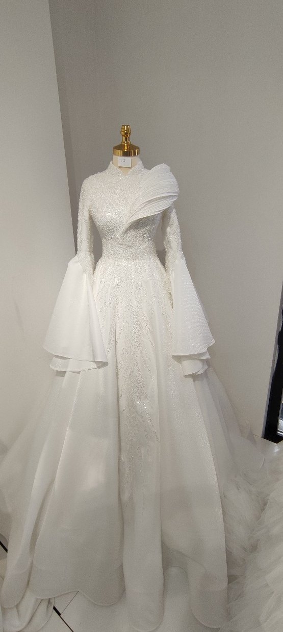 Uzun kollu, yüksek yakalı ve klasik şıklıkta beyaz prenses gelinlik. Uzun boyu ve normal kesimiyle göz alıcı bir tasarıma sahiptir. Tek omuzdaki detayı ve kollarındaki volanlari ile hoş bir görüntü sunar. Üst kısmı ve eteğinin önü resimdeki gibi işlemelidir. Arkası korseli bir üründür.✨