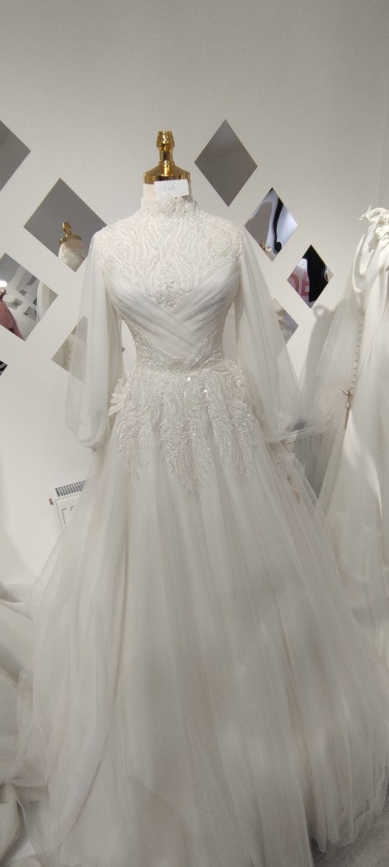 Uzun kollu, hakim yaka ve a kesime sahip beyaz gelinlik. Göğüs kısmındaki çapraz drape tasarımı, balon kolları ve eteğin üst kısmındaki dantel detayıyla şık ve gösterişli bir tasarım sunar. Arkası korseli bir üründür.