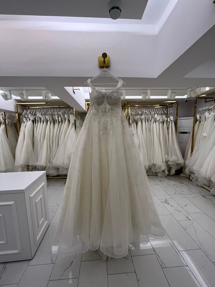 Askılı ve modern klasik tarzda A kesim uzun beyaz gelinlik. Düzenli kesim ve ışıltılı detaylarla gösterişli bir görünüm sunar. M ve L beden ile uyumludur.Duvak ve tarlatan dahildir.