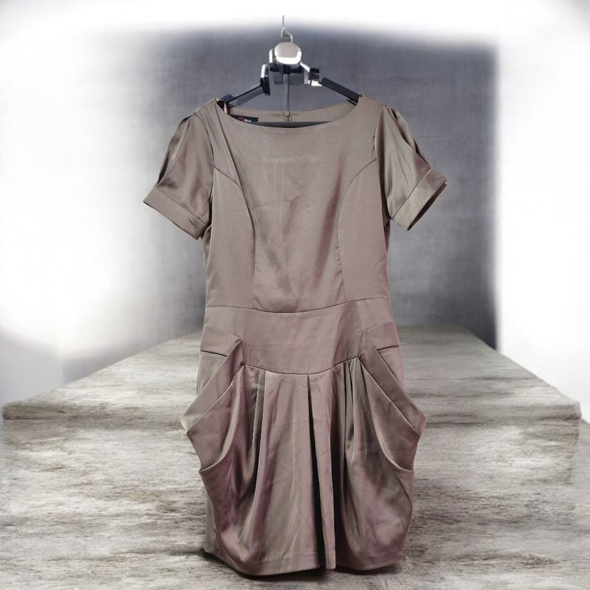 Bej renkte, pilili midi boy, kısa kollu, yuvarlak yakalı, bol kesim kadın elbisesi. Ofis için uygundur.