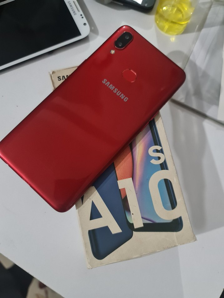 Samsung Galaxy A10S, koyu kırmızı renkte çift arka kameralı ve parmak izi sensörlü bir Android telefondur. Şık ve kullanışlı bir tasarıma sahiptir.