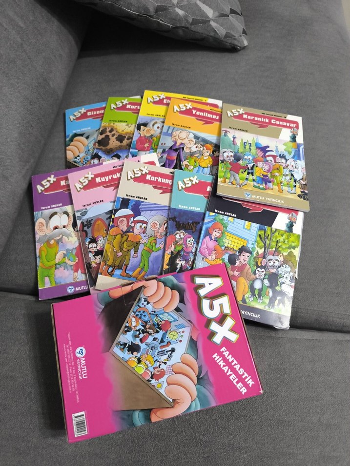 Renkli kapaklara sahip, çeşitli hikayeler içeren "A5X Fantastik Hikayeler" adlı çocuk kitapları seti. Birden fazla cilt içerir.