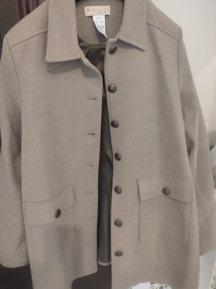 Bej renkte, keten kumaştan yapılmış midi boy, düğmeli, notched yaka kadın kaban. Uzun kollu ve normal kesimdir, ofis kullanımı için uygundur.