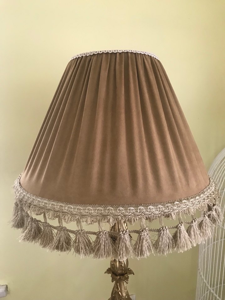 Bej renkli kumaştan yapılmış, püsküllü kenar detayıyla şık ve yumuşak bir görünüm sunan abajur. Açık bej tonu sıcak ışık verir.