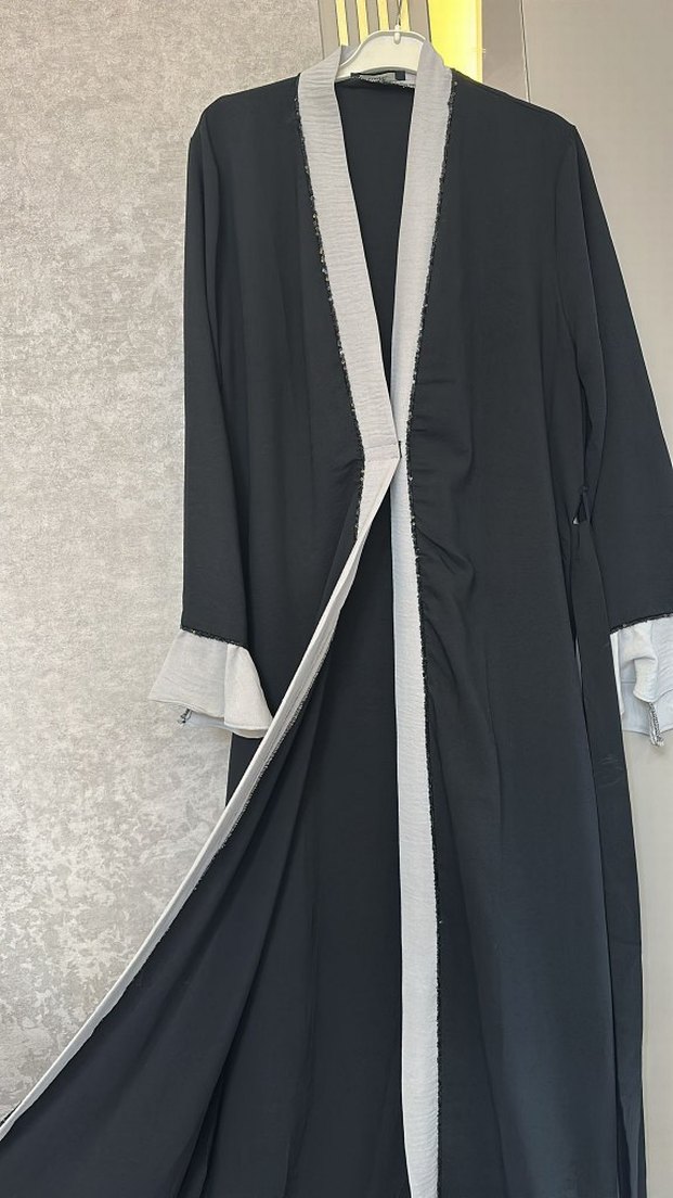 Uzun kollu, düz desensiz gri elbise, regular fit kesimi ve Parisli gotik tarzını yansıtıyor. içliği yok sadece üst