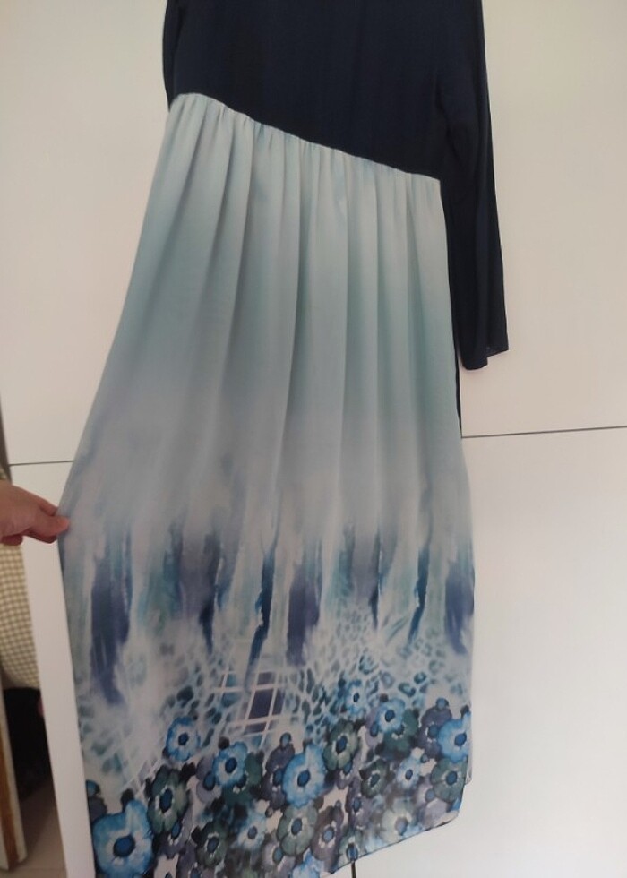 İnvee marka 1 beden lacivert kumaşı keten desenli kısmı şifon kumaşa sahip abaya.
