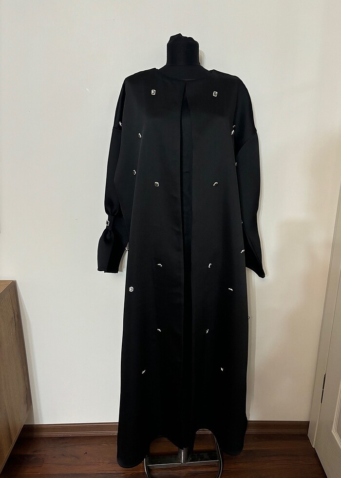 Elde taş işlemeli saten kumaş ikili takım abaya modelimiz istenilen ölçülerde kişiye özel olarak dikilmektedir.