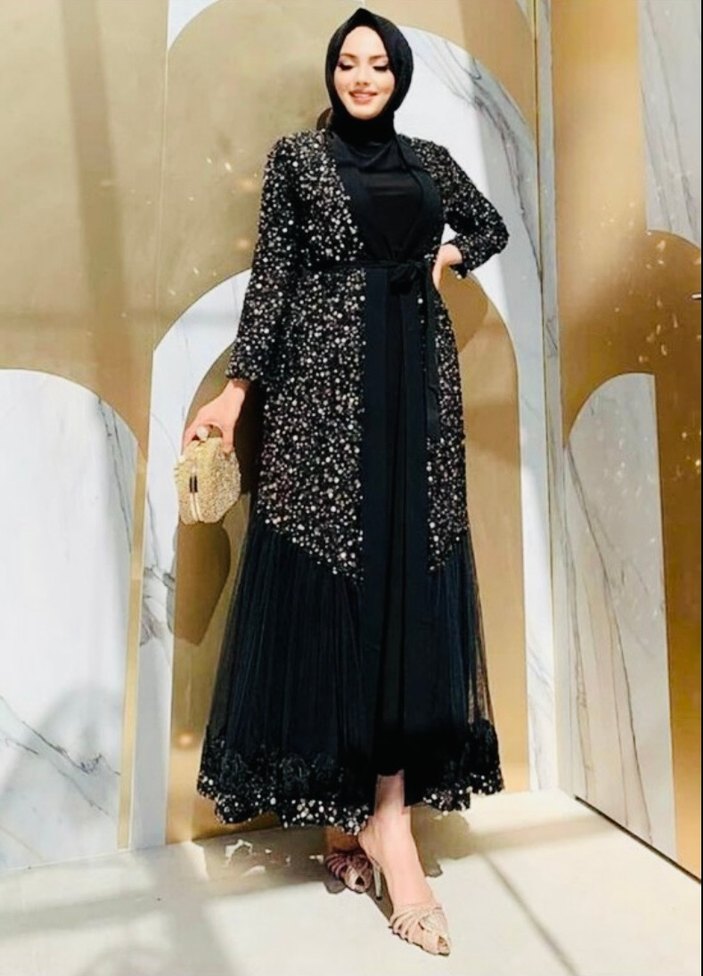 Düğünlerin vazgeçilmezi olacak şıklıkta, çok özel bir abaya! Belden yukarısı tamamen gümüş yansımalı siyah pullarla kaplı – ışıkta parıl parıl parlar, dikkat çeker. Belden aşağısı yumuşak tül kumaştan, uç kısımlarında zarif işlemeler bulunur. Hafif yapısı sayesinde rahatça hareket edilebilir, aynı zamanda çok şık bir duruşa sahiptir. Özel günlerde, düğün ve nişan davetlerinde tercih edilecek parçalardan biri.