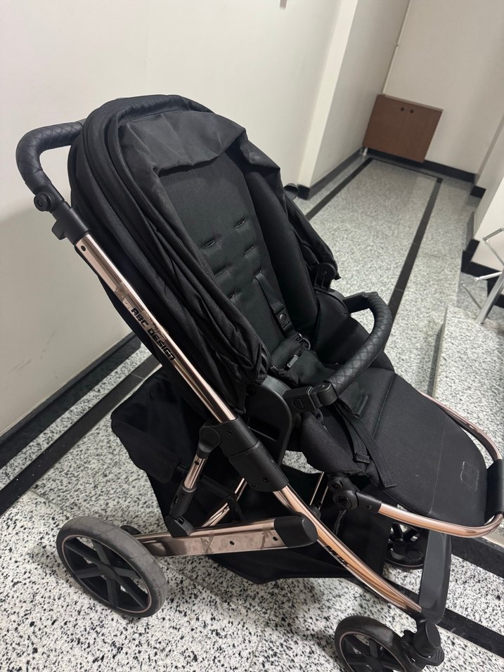 Siyah bebek arabası katlanabilir tasarıma, sağlam iskelete ve rahat dolgulu koltuğa sahiptir. Güvenlik kemeri ve büyük tekerlekleri bulunur. Bebeğin yatması icin ayrı yatağı mevcut hic kullanılmamış
