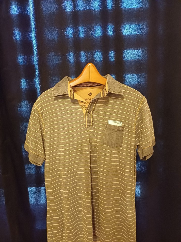 Erkekler için çizgili, düğmeli kısa kollu, yakalı polo tişört. Rahat kesim ve normal boydadır, sentetik kumaştan üretilmiştir.