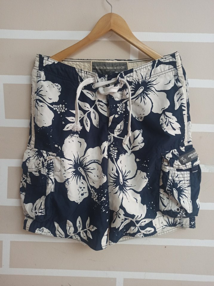 Lacivert renkli, çiçek desenli, düğmeli ve bağcıklı erkek mayo şortu. Rahat kesimiyle plajda şık bir tercih.