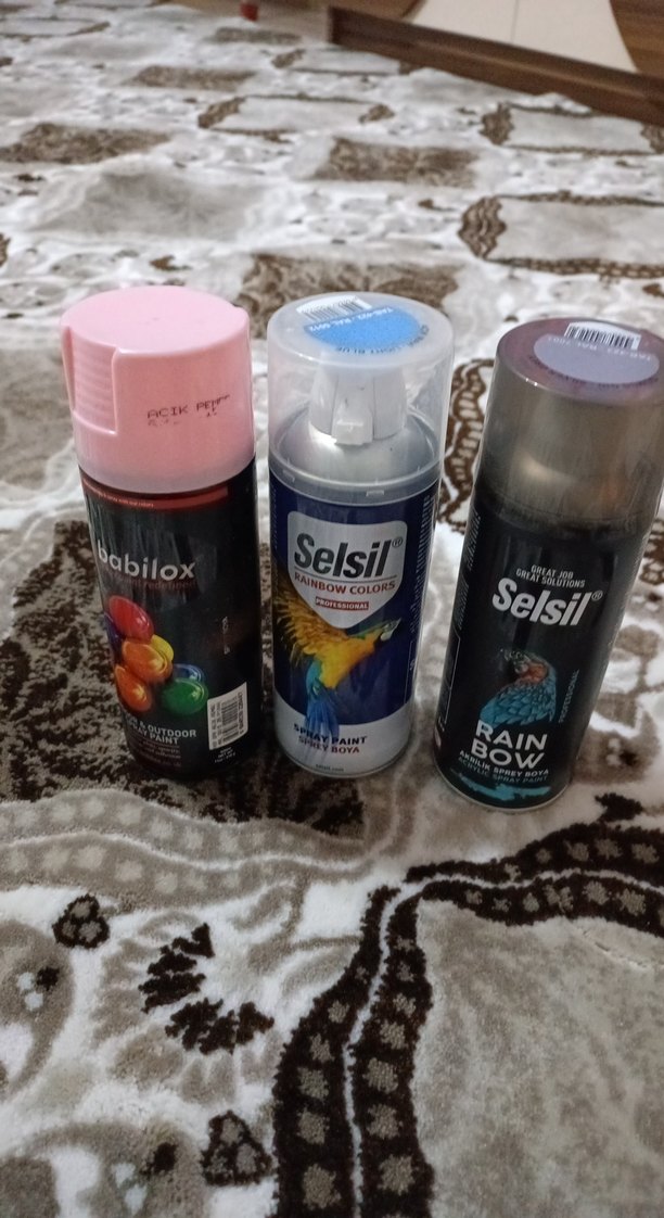 Abilox ve Selsil markalarına ait renkli ve şeffaf kapaklı boya spreyler. pembe ve mavi cok az sıkıldı bişe denemek için o da olmayınca burdan geri satmak istiyorum
