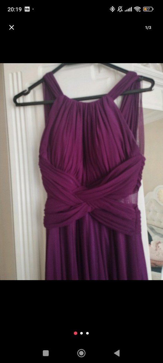 Mor renkte, V yakalı ve askılı, drapeli uzun ve vücuda oturan abiye elbisedir. Düğün gibi özel anlar için uygundur. 34.36 bedene olr
