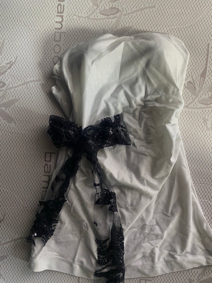 Beyaz, göğüs destekli, midi uzunlukta ve siyah dantel kurdele detaylı, düz kumaştan yapılmış, vücuda oturan korse.