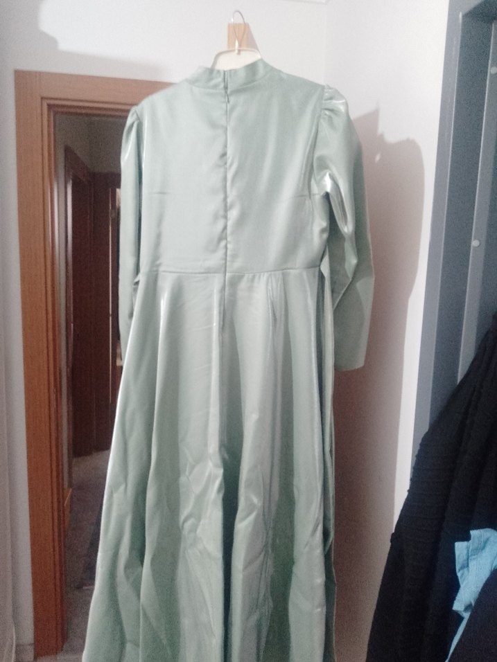 Uzun, bol kesim, drapeli ve V yakalı kadın elbisesi. Yumuşak sentetik kumaştan, pastel bej renkte, uzun kolludur. Vintage tarzını yansıtır.