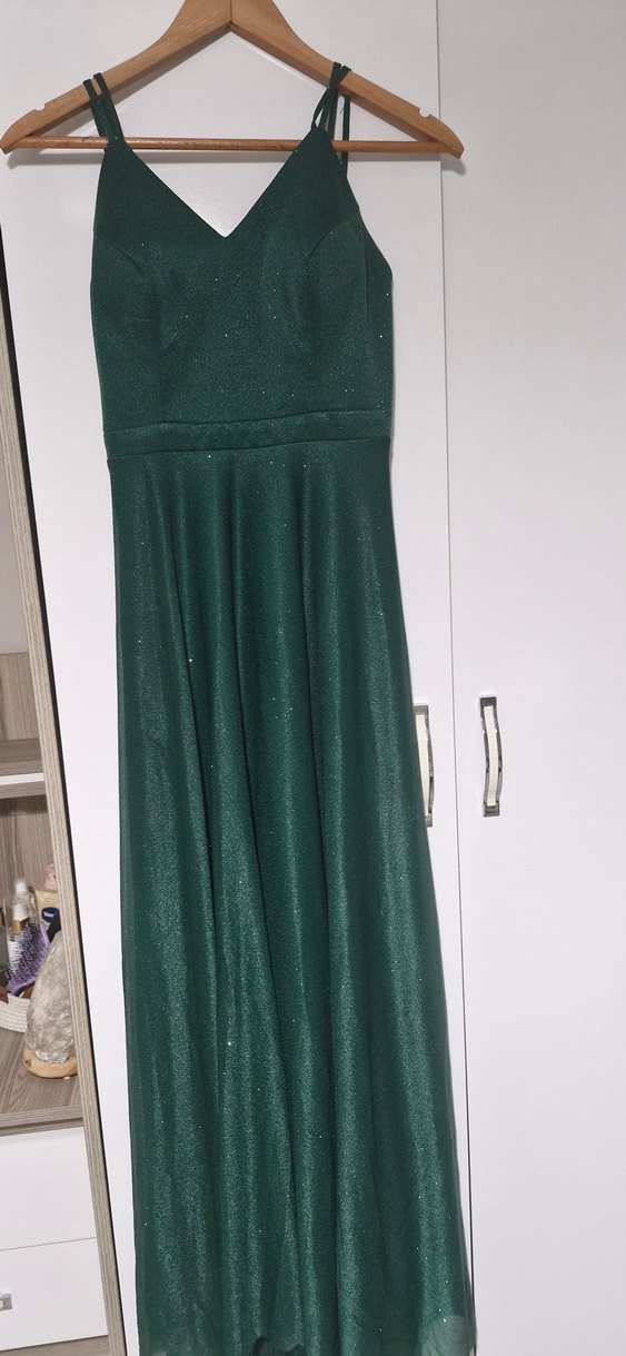 parlak yeşil renk abiye arkadan bağlamalı ve fermuarlı. fotoğrafta belirttiğim gibi sadece bağlama kısmında sökülme mevcut. boyum 1.55 kilom 45. boyu biraz daha uzun olan birinede olur.