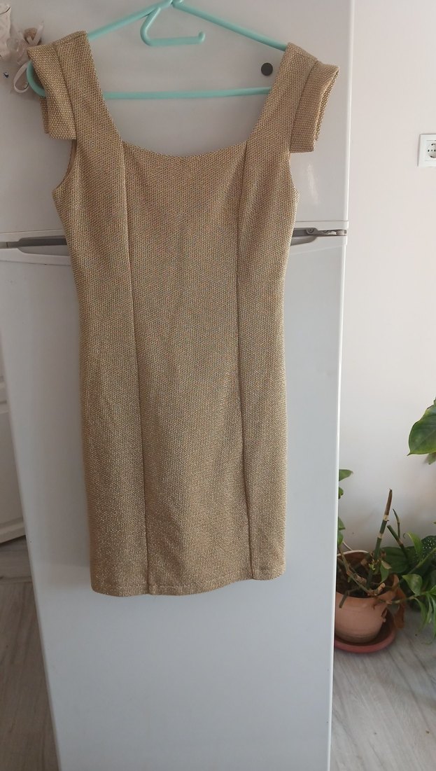 Bej renkte, kolsuz ve kayık yaka simli gece elbısesı midi boy ve vücuda oturan kesimle harika bir elbıse...1 gece giydim...dar oldugu ıcın satısta...2 kol arası 44 boy 90 cm
