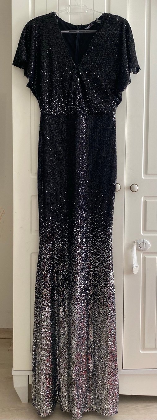 Full payet uzun abiye siyahtan gümüşe doğru renk geçişli v yaka salaş kol