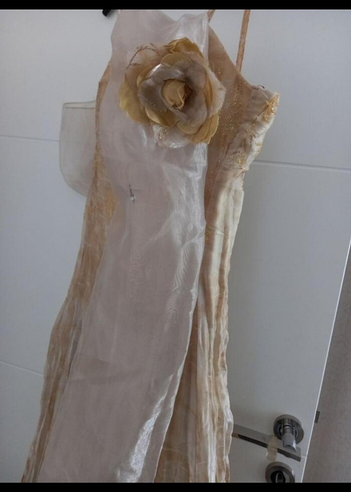 Abiye altin sarisi bej karisimi abiye 1kez giyildi s 36 beden 56 kiloya kadar uyumlu şalı ve saca takılan gül aksesuariyla birlikte satilmaktadir.