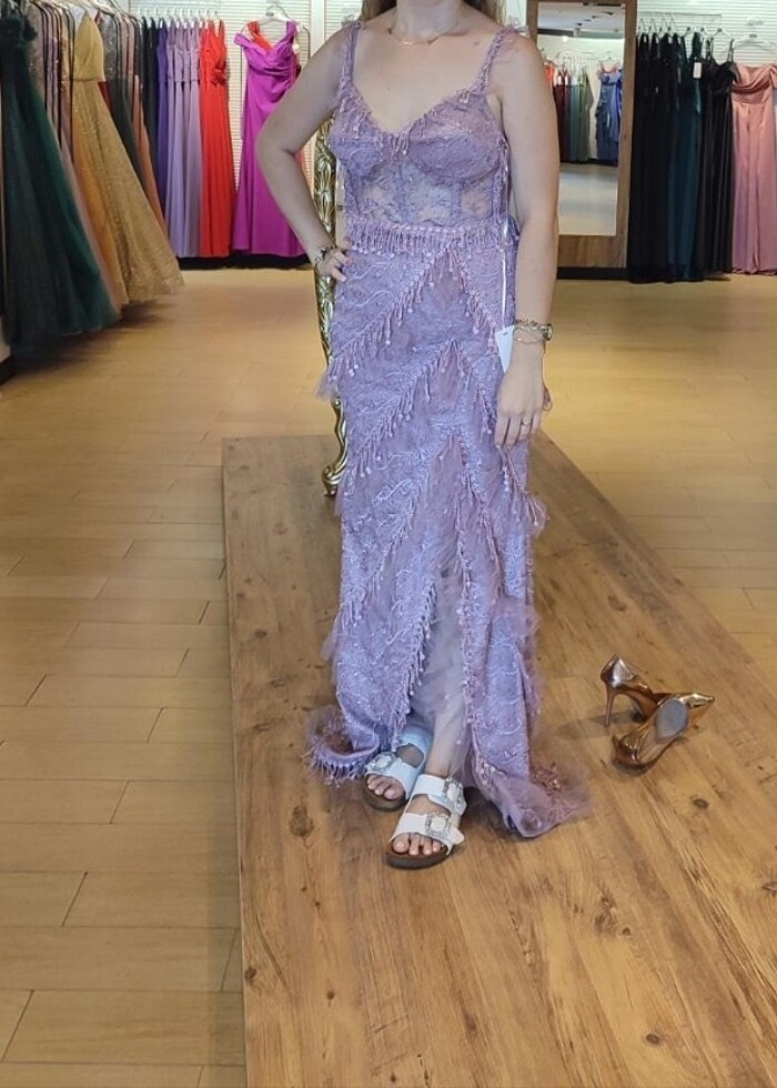Lila rengi 40 beden manken boyu 170 69 kg diz hizasında yırtmaçlı abiye birkez giyildi