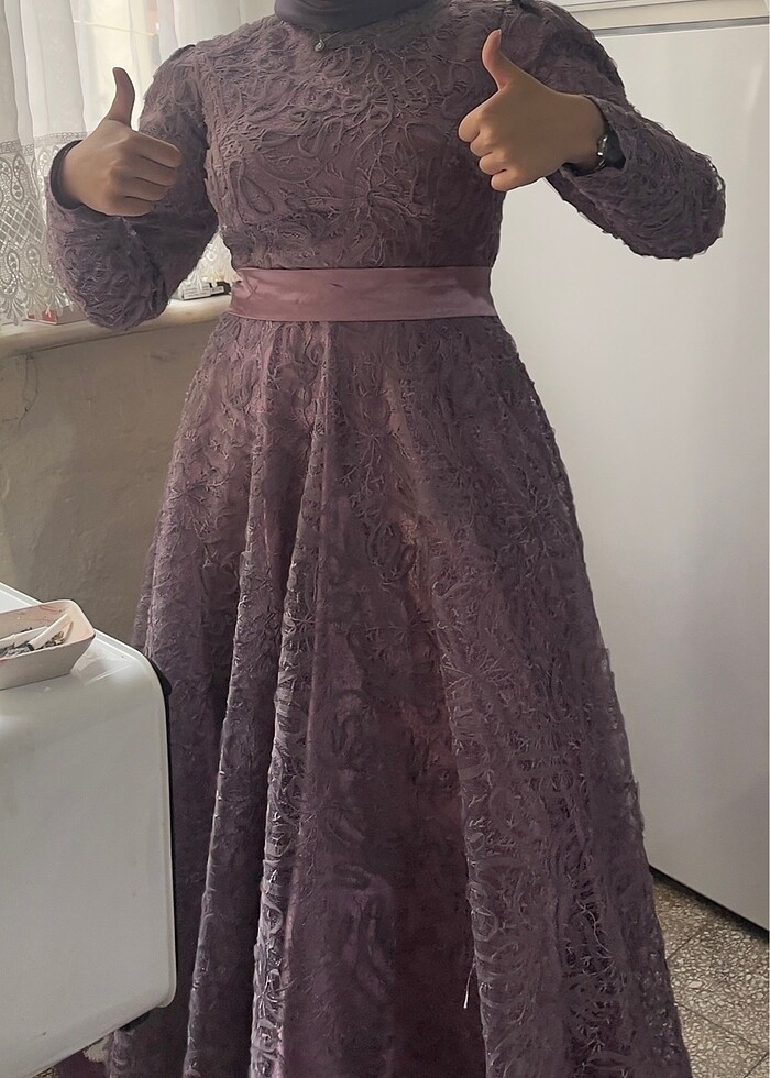 Çok beğenerek giydim(1 kere giyildi) içinin astarı her şeyiyle oldukça rahat, kuşağını isteğinize göre takabilirsiniz,dışı dantel işlemeli, özel olarak 2m boyunda abiye renginde bir şal kestirdim şalı düşünenler için iletişime geçebilirim