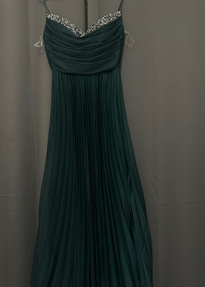 Üründe herhangı bır deformasyon yoktur 38 beden Kuru temızlemeye uygun Pileli göğüs dekoltelı taslı abiye 1 kere nişanda giyildi Zümrüt yeşili