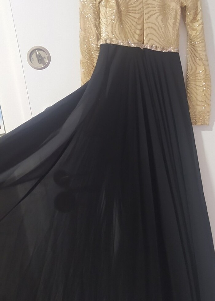 Alt kısmı Mevlana tarzı şifon çok hoş bir abiye yandaki boncukta açılma var yapistirilabilir onun dışında hiçbir sıkıntısı yok 38=40 bedene rahatlıkla olur