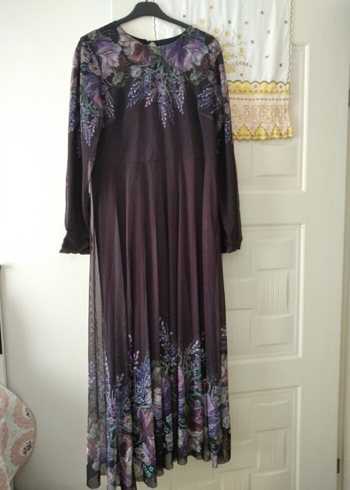 Ürünü iki kez giydim güzel siyah ve mor renkli karışık desenli şık bir abiye elbise bn 100 kiloyum 157 boyundayim