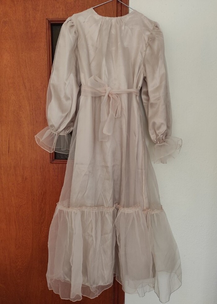 Pudra renk tül abiye. Bir kez giyilmiştir. 2 bedendir. Bir hasarı yoktur. Rengi fotoğraftaki gibi.