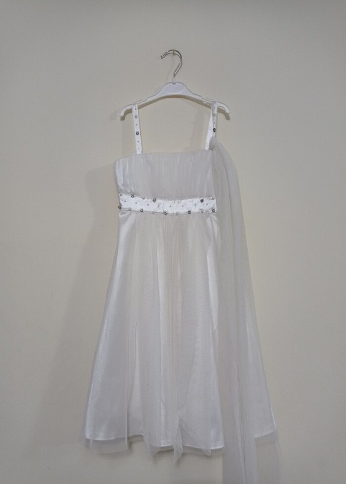 İp askılı, boncuk detayları olan, düğünlerde vs özel günlerde kullanılabilecek, oldukça şık, içi astarlı, temiz kullanılmış, isteğe bağlı takılıp çıkarılabilir fuları bulunan güzel bir abiye.