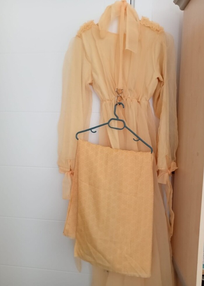 Her ikisini de sadece 1 kez baloda kullandım. Hiçbir sorunu yoktur.38-40 bedene uyumludur. İç astarlı sarı tül elbise. Şal: Tuğba Elbise:Fahhar