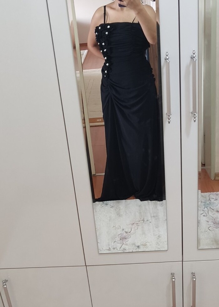Önde inci detaylı ince askı şifon büzgülü içinde astarı mevcut.