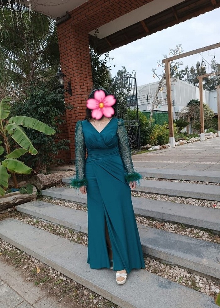 Çok şık bir kez giyildi, likralı kumaş. Fotoda rengi tam olarak çıkmadı, zümrüt yeşili bir elbise