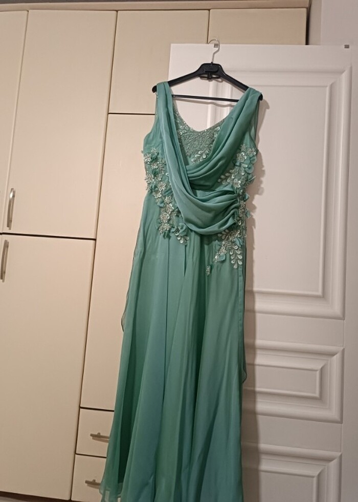 Janjanlı şifon tasarım abiye, kızımın düğünü için modaevinde diktirilmiştir. 40 bedene uygundur. Turkuaz rengindedir