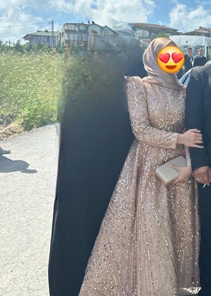 İki kere giyildi.iç kabarık kısmı kesildi A kesim. Şalıyla beraber satıyorum.elbisenin rengi gold rose. Daha net foto atılır.