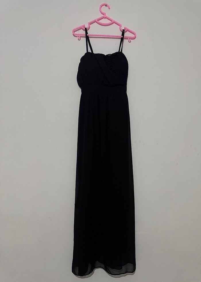 Siyah abiye sadece bir kez giyildi askıları ayarlanabilir. Üstünde dantel detayları var.