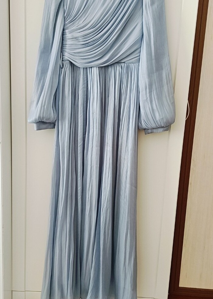 Sıfır aldım. Sadece kınada giydim. Etiketini bile çıkarmadım.3500 normal fiyatı. Gayet şık bir abiye. Rengi gri, gök mavisi gibi. Kumaşı janjanlı kumaş. Yanında şal hediyeli. Şalın boyu 2,5 metre. Kestirme kumaş. Şalın maliyeti bana 400 tl'ye geldi.Şalın kenarlarına overlok çekildi.