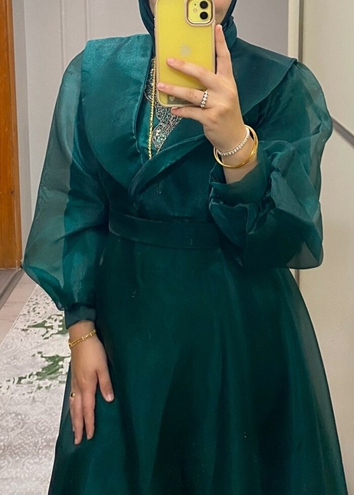 Ürün 1 kere kullanıldı sorunu yoktur 44 bedendir renk zümrüt yeşili kemeri vardır